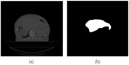 Example of a CT scan from the private dataset: (a) CT scan image/slice; (b) liver segmentation ground truth mask.