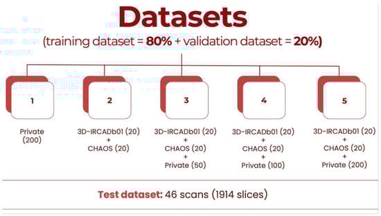 Figure 4 presents the distribution and structure of each dataset used to train, validate, and test the models. Slices with no liver were not used.