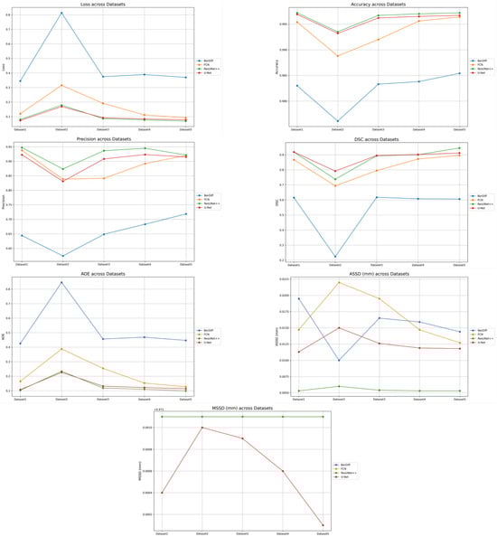 The U-Net model presented versatility and robustness across all the datasets, as illustrated in Figure A1. This figure shows the segmentation outcomes for U-Net across experiments. Its consistently high DSC scores, even when applied to public datasets (maintaining DSC > 0.79), underscore its strong generalization capacity. This model exhibited a good ability to adapt and improve with the PDI, as evidenced by steady enhancements in both DSC and AOE metrics. Perhaps most notably, U-Net’s boundary delineation capabilities proved exceptionally precise and stable, maintaining a remarkable ASSD ranging from 0.0113 to 0.0150 mm across all experiments. This consistent performance in boundary precision, as well as its strong overall segmentation accuracy and adaptability, make U-Net a highly reliable and efficient choice for the objectives of the project.