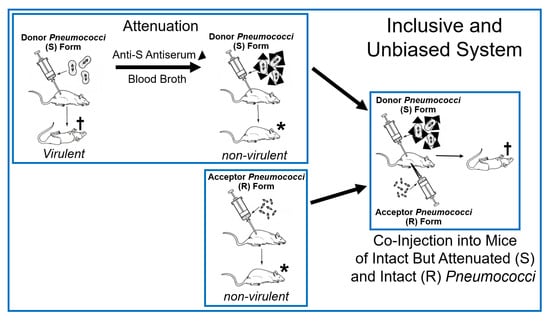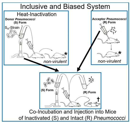 The epochal experimental designs, as realized by Frederick Griffith in 1928 [], are briefly presented to provide a common basis for both their canonical and alternative interpretations. Pneumococci (Diplococcus or Streptococcus pneumoniae) of smooth (S) pathogenic serotypes, which are characterized by the presence of a capsule consisting of variable glycophospholipids, typical O-acetylated lipopolysaccharides (LPS) and lipoproteins (LP) anchored at the peptidoglycan layer. This capsule determines the immunological serotype of Pneumococci (for a review, see Refs. [,,]) and mediates eventual evasion from phagocytosis by the immune system of the host (for a review, see Refs. [,,]), leading to the death of normal mice upon injection (virulence). This experimental system turned out to be, per se, inclusive and unbiased (Figure 1).