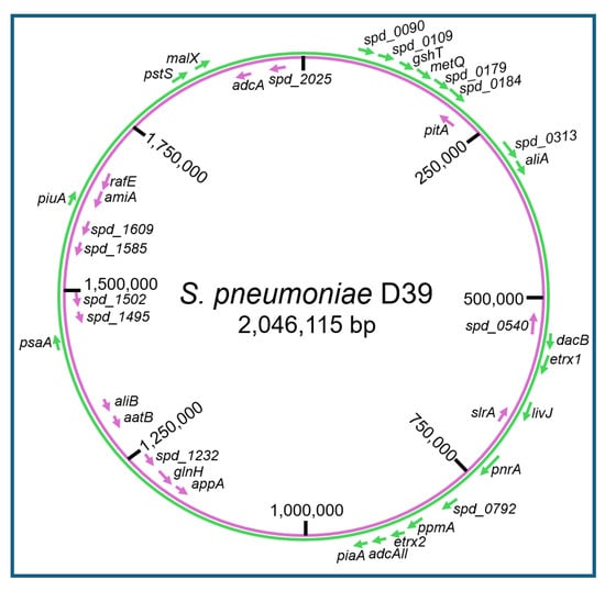 Genes for the biogenesis of LP in S. pneumoniae. Map of the genes engaged in the biogenesis of LP with their localization, distribution (annotation according to the common gene database of bacteria) and orientation (green arrows represent the coding strand, pink arrows the reverse strand) along the chromosome as depicted in a circular configuration of the pneumococcal genome (not drawn at scale, according to Refs. [,,]).