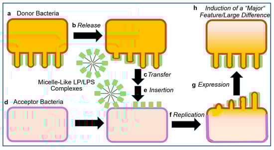 Hypothetical model for the transformation of acceptor bacteria by micelle-like LP/LPS complexes for the induction of a major feature or large phenotypic difference. (a) Donor bacteria display a considerable number of “membrane landscapes” of complex configuration, e.g., protuberances, which are assembled by interactions between (glyco)phospholipids, LPS, lipidated (i.e., double or triple fatty acylated) LP (indicated in green as the surface covering the protuberances) and peripheral as well as transmembrane elements of the bacterial cytoskeleton (not indicated here). (b) Micelle-like LP/LPS complexes constituted by the same components (only the lipidated LP as green cuboids with the acyl chains indicated as single green lines are depicted under omission of all other putative micellar components) become released from the “membrane landscapes”, e.g., protuberances. (c) Upon transfer of the micelle-like LP/LPS complexes to acceptor bacteria (d) which lack protuberances, (e) the components of the complexes, among them the lipidated LP, become inserted into the acceptor PM. (f) Replication of the “membrane landscapes”, which are configured around the newly inserted components of the transferred complexes, prior to the next cycle of release, may be explained by a hypothetical molecular mechanism, called PM memory. (g) This and the ongoing DNA-dependent expression of lipidated LP and other components of the complexes (h) leads to transformation of the acceptor bacteria exhibiting a major feature or large difference in the course of the gradual expansion of the “membrane landscapes”, e.g., protuberances, over their surface. The gradual increase in intensity from light to dark brown color along steps (g) and (h) indicates the continual phenotypic chance from acceptor to donor bacteria.