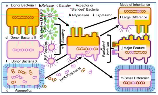 Alternatively, or in addition, micelle-like LP/LPS-complexes or PM/OM vesicles may transfer components of “membrane landscapes”, such as protuberances or blebs, from donor to acceptor bacteria. Certainly, the “blending” process becomes supported by the parallel exchange of DNA fragments between the donor bacteria in the course of recombination and subsequent initiation of the synthesis of novel components required for hybrid “membrane landscapes” in the acceptor or “blended” bacteria. In contrast, attenuation of donor bacteria by heat treatment (design 1.1) will cause transformation of acceptor bacteria solely by the released DNA fragments, leading to inheritance of only small differences (Figure 6).