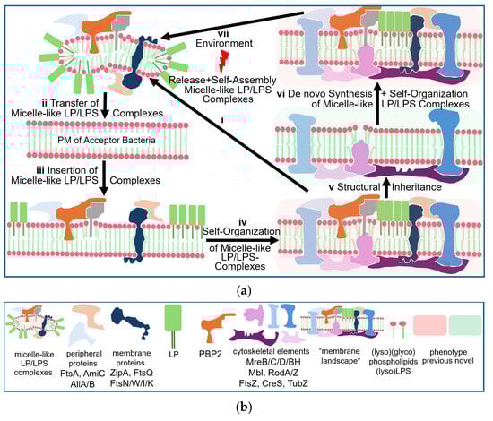 The formation of “membrane landscapes” in the course of self-organization with pre-existing components of cytoskeletal elements (see below Figure 7a, steps iv and vi), as well as through self-assembly with de novo synthesized components of micelle-like LP/LPS complexes (see below Figure 7a, step i), may rely on weak linkages and, in consequence, enable “facilitated variation”.