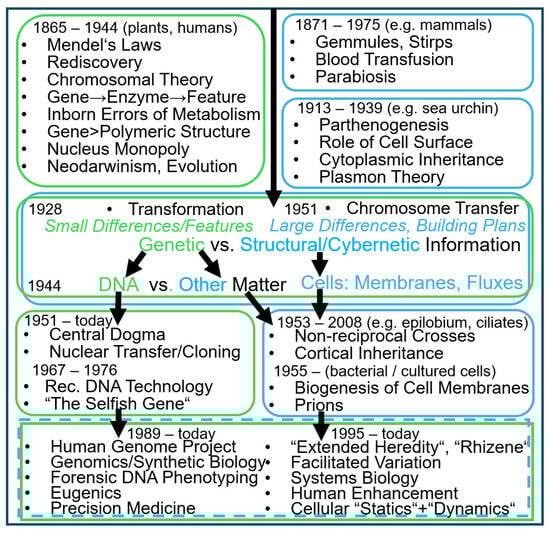 In conclusion, all the above findings, raised in the course of the next three decades following Griffith’s transformation experiment, were based on and confirm the DNA-centric view of inheritance. DNA was thought to be both necessary and sufficient to provoke phenotypic changes, i.e., small features and minor differences, at least in acceptor bacteria. Thus, the focus on the replication and transfer of solely DNA concomitantly led to disinterest for analogous processes ensuing the biogenesis of (sub)cellular structures, such as biological membranes and organelles, as well as the maintenance of metabolic fluxes, such as regulatory (feedback) loops and turnover of cellular constituents and metabolites (for further discussion, see below and Ref. []). This resulted in extreme reductionism with ultimately narrowing of cellular heredity down to DNA heredity in a sequential fashion with exclusion of cybernetic, topological, and macromolecular heredity under accompanying sequential elimination of non-DNA matter, i.e., regulatory, structural, and self-replicating matter as well as information. The delineation of the agency of the various (f)actors contributing to this biological reductionism, including its putative consequences with regard to the creation of novel microorganisms, in general, and lower eukaryotes, in particular, as well as with regard to limitation of the predictability, controllability, and manipulability to solely small features and minor differences rather than total building plans and large differences represents the topic of this review.
