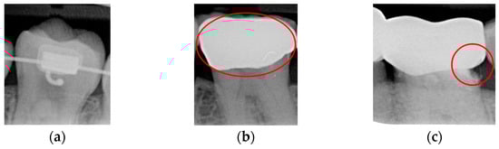 BW images with disease. (a) Dental braces. (b) The red circle represents the restoration. (c) The gap in the red circle indicates dental caries under the restoration.