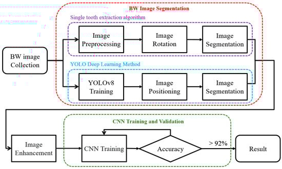 This study aims to develop an automated system to help dentists quickly detect caries under dental restoration and dental brace. However, the diverse shapes and orientations of teeth in BWs present significant challenges for accurate individual tooth assessment. Thus, we first locate and segment each tooth in the BW by YOLO. At the same time, we implemented the proposed rotation-aware segmentation on the BW and evaluated its performance compared with YOLO-based detection. Subsequently, we applied image processing algorithms and conducted an ablation experiment to optimize caries detection under dental restorations and orthodontic braces. These experiments enabled the model to achieve its highest detection precision by effectively isolating the target regions and minimizing background interference with CNN training. The overall flow chart is shown in Figure 2.