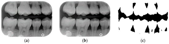 A complete BW varies due to factors such as angle, exposure size, the number of teeth, and interproximal spacing. Using fixed parameters and thresholds can lead to misjudgments and low segmentation efficiency. To enhance flexibility and operability, the algorithm uses adaptive thresholds tailored to each BW based on brightness, size, and the number of teeth. Each BW is pre-processed before segmentation due to variations in mouth shape, tooth shape, and imaging angle. This study first applies to a gaussian high-pass filter to eliminate noise, reducing segmentation errors. Next, the images undergo binarization and erosion techniques to clarify background contours, making them easier to distinguish, as illustrated in Figure 3.