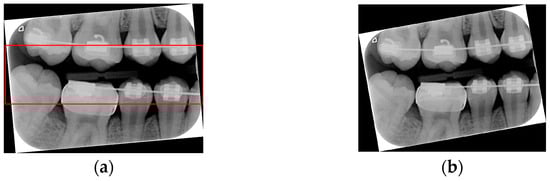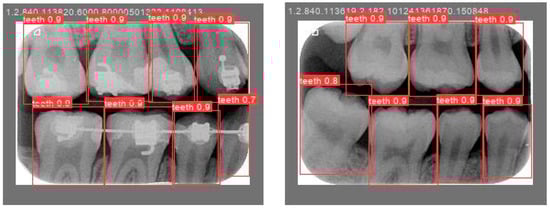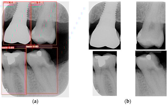 Caries are a prevalent issue in dental healthcare, affecting nearly all adults and 60–90% of children, posing a significant public health challenge, especially with dental braces or dental restorations [,]. Traditional dental examinations relying on visual inspection or radiographic images [,] can be subjective and time-consuming. Related studies have utilized auxiliary software for oral examinations, such as methods of geometric alignment to compare noise levels in subtraction images [], jawbone regeneration [], and corticalization measurement []. With the rise of AI, automated caries detection using image processing and deep learning technologies has gained increasing attention []. Deep learning techniques such as convolutional neural networks (CNNs) have shown significant performance in medical image classification by leveraging large-scale annotated datasets [,]. In dentistry, CNNs have been applied to detect apical lesions, offering objective interpretation and reducing diagnostic time []. Bitewing radiographs (BWs) are commonly used to identify caries and periodontal conditions. Tooth region extraction from BWs can be performed using filtering, binarization, and projection methods [,,,]. The YOLO object detection algorithm enables real-time localization with high accuracy and speed [,]. This study uses YOLO to detect caries under restorations and dental braces, as illustrated in Figure 1.