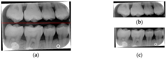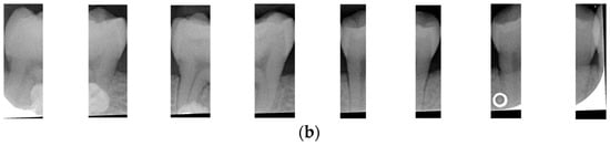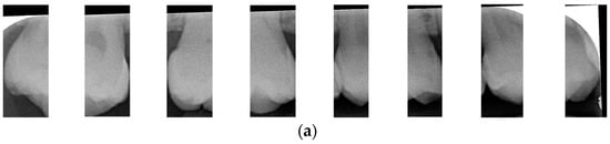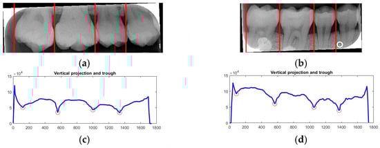 After dividing the BW into upper and lower rows of teeth, each tooth is segmented individually. Vertical projection and vertical erosion are used to find the troughs (y-minimum) of the adjacent waveforms, identifying the gaps between teeth to separate each one. The number of vertical lines required varies with the number of teeth in each row. If the number of teeth is n, then n − 1 vertical lines are needed for complete segmentation. These n − 1 lines correspond to the number of troughs found in the vertical projection of the waveform. The x-coordinates of these troughs are returned to the original image, where vertical lines are drawn to isolate the teeth. The peaks and valleys are marked with red circles in Figure 6a,b, which is shown in Figure 6c,d. Because secondary caries mainly occurs on both sides of the teeth, and since each complete tooth has both a left and right half, this increases the complexity during training and judgment, resulting in poor training outcomes. Therefore, each tooth image is further divided into left and right halves, as shown in Figure 7. This approach reduced the complexity of the data and doubled the training dataset, providing more data for training.