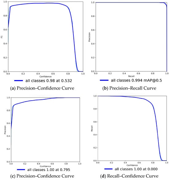 Training result data and data chart. (a) Confidence curve. (b) Precision–recall curve. (c) Precision–confidence curve. (d) Recall–confidence curve.