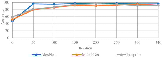 Various CNN models were employed for image classification within the domain of deep learning. Using AlexNet as a representative example, Table 2 illustrates the architecture of each layer with the AlexNet model. During the training phase, each image in the validation set was individually verified to calculate the average validation accuracy. The CNN model was trained using these classified datasets, with the input image size configured to 227 × 227 × 3. This setup allowed for a consistent and standardized input size for the model. The design of the model involved modifying the last three layers, fully connected, softmax, and classification layers, and replacing them with fully connected layers specifically configured to classify the images into two categories, corresponding to the primary classes being analyzed. After the deep learning model was trained, images from the test set were randomly input into the model to assess its performance. The model classified these images based on the features it learned during the initial training phase. A confusion matrix was then generated to analyze the classification results, providing a detailed breakdown of the model’s accuracy and performance. This matrix allowed for a clear visualization of how well the model distinguished between the different classes, highlighting areas of strength and potential improvement. This systematic procedure comprehensively assessed the CNN’s performance in classifying BWs.