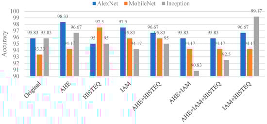 Figure 14 illustrates the impact of various image enhancement techniques on the classification accuracy of three CNN architectures with AlexNet, MobileNet, and Inception for detecting caries under restoration and dental braces. Among all models and enhancement strategies, the highest overall accuracy (99.17%) was achieved by Inception using the IAM + HISTEQ combination, highlighting the effectiveness of combining intensity adjustment and histogram equalization in enhancing lesion visibility. AlexNet performed best (98.33%) when using AHE alone, while MobileNet achieved its highest accuracy (97.5%) with the HISTEQ technique. Compared to the original, unenhanced images, AlexNet, MobileNet, and Inception achieved 95.83%, 93.33%, and 95.83%; the enhancement techniques generally improved accuracy across all models. However, excessive combinations such as AHE + IAM and AHE + IAM + HISTEQ led to decreased performance, especially for Inception (down to 90.83%), likely due to overprocessing and feature distortion. These results suggest that appropriate image preprocessing plays a critical role in improving the diagnostic performance of CNN models and that the selection of enhancement methods should be tailored to the model architecture to achieve optimal outcomes in caries under restoration and dental brace detection.