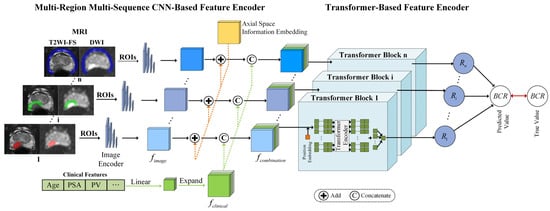 In this section, we present a comprehensive description of our proposed MRMS-CNNFormer architecture. As illustrated in Figure 1, the MRMS-CNNFormer framework comprises two principal components. The first component implements a multi-region, multi-sequence CNN-based feature encoder that systematically extracts discriminative features across diverse spatial regions. The second component utilizes a transformer-based feature encoder to effectively fuse multi-modal features from imaging and clinical data. Finally, the integrated features are fed into an FC layer to generate precise BCR prediction values. The architectural details of each component are elaborated in the following subsections.