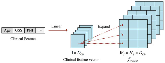 The two categories of clinical data are combined to form a vector, as illustrated in Figure 2. To explore the relationships between individual clinical parameters and imaging characteristics, the original clinical feature vector undergoes linear transformation and dimensional expansion to align with the image-feature dimensions. Specifically, each element in the clinical feature vector is replicated to create a matrix matching the width and height of the slice image. This process generates the expanded clinical feature representation, denoted as .