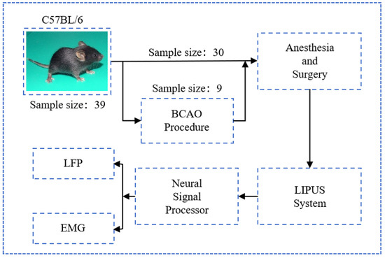 As depicted in Figure 1, a total of 39 male C57BL/6 mice (all male, body weights 20–25 g, Beijing Vital River Laboratory Animal Technology Co., Ltd., Beijing, China) were utilized in the experimental procedures; nine of them underwent BCAO surgical modeling. All experimental protocols were conducted in strict compliance with the guidelines established by the Animal Ethics and Administrative Council of Yanshan University and Hebei Province, People’s Republic of China. Surgical anesthesia was administered through intraperitoneal injection of sodium pentobarbital (3%, 5 mg/100 g body weight). Following anesthesia induction, the animals were securely positioned in a stereotaxic apparatus (model: 6800268030, RWD Co., Shenzhen, China). The cranial region was prepared by shaving the scalp hair and disinfecting the area with normal saline. A midline incision was made along the sagittal suture, followed by meticulous removal of connective tissue and periosteum to expose the skull surface. Utilizing stereotaxic coordinates derived from the mouse brain atlas, precise identification of the motor cortex was achieved. Upon completion of experimental procedures, euthanasia was performed through administration of an anesthetic overdose by institutional animal care protocols.