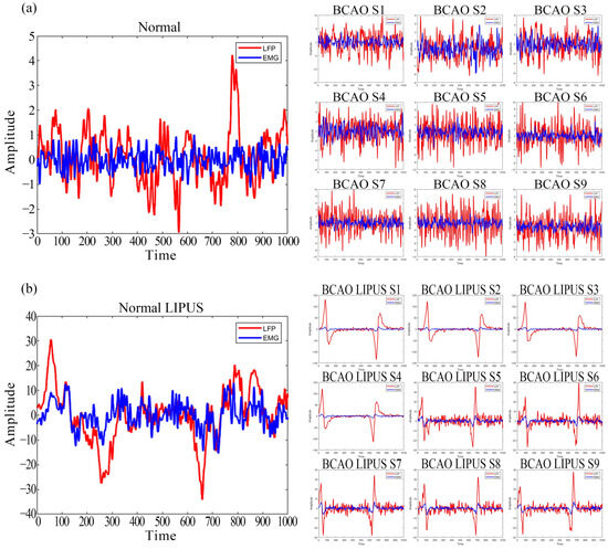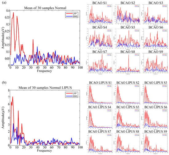 As depicted in Figure 8a, the frequency-domain signals of averaged LFP and EMG from 30 trials in normal mice were compared with pre-stimulation frequency-domain signals from nine BCAO models. The results show that the overall energy of the LFP frequency-domain signals of normal mice is slightly larger than that of the corresponding EMG frequency-domain signals. The energy was concentrated in the 40 Hz frequency range. In contrast, the LFP amplitude of the nine BCAO mice significantly exceeded that of the EMG, with the maximum LFP amplitude nearly four times that of the EMG. The energy was not concentrated in the lower frequency band. In addition, the variability of LFP and EMG signals was significantly higher in the nine BCAO mice compared with the normal group.