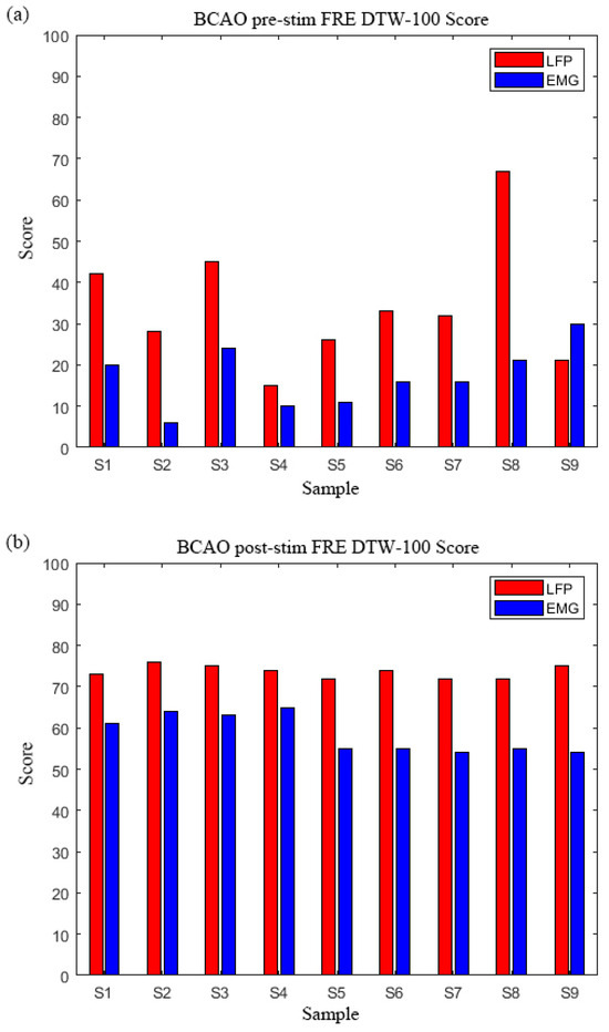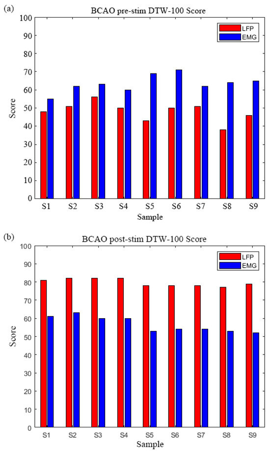 As depicted in Figure 6b, the inverse pattern emerged post-stimulation, with LFP scores demonstrating marked elevation over EMG, LFP DTW-100 range: 77–82, EMG DTW-100 range: 52–63. Samples 2–4 exhibited identical peak LFP scores while maintaining stable EMG values. The group mean LFP score (79.7 ± 1.8) surpassed EMG values (56.7 ± 4.3) by 40.6%, with maximal contrast in Sample 9.The DTW-100 score of each sample is shown in Table A1.