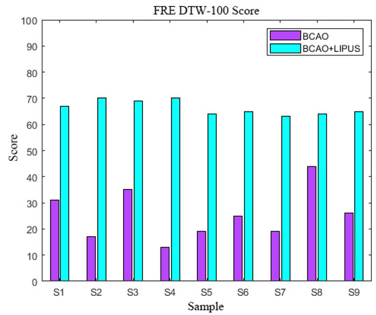 As depicted in Figure 7, the composite DTW-100 scores, derived from the weighted summation of pre-stimulation LFP and EMG values, revealed significant enhancement following LIPUS intervention. Comparative analysis demonstrated a consistent elevation in DTW scores across all BCAO samples after LIPUS treatment. The mean increase in DTW-100 scores was 14.4 ± 3.6.The DTW-100 score of each sample is shown in Table A1.