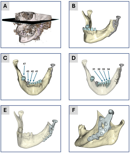 Illustration of the segmentation and model generation process. (A) Threshold-based image of the 3D tomogram giving an overview of the patient situation. (B–D) The results from the academic workflow and (E,F) the results from the industrial workflow. (B) Lateral view of the segmentation result. (C) Anterior view of the geometric 3D model after segmentation. (D) Same illustration as (C) with transparent bone to show the segmentation of the teeth and the position of the screws. The numbers correspond to the numbering of teeth according to the FDI world dental federation notation. (E) Segmentation results together with the CAD data of the treatment from the surgical planning. (F) Overview of the CAD data for visualization of the treatment. Items (A–D) were generated based on data from ScanIP, and items (E,F) were generated using data from Mimics; see the Segmentation and 3D Geometric Model Generation section of the two workflows below for further details.