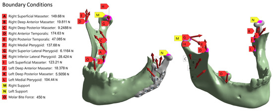 To simulate the post-operative stabilization, the condyles were fixed. The boundary conditions are given in