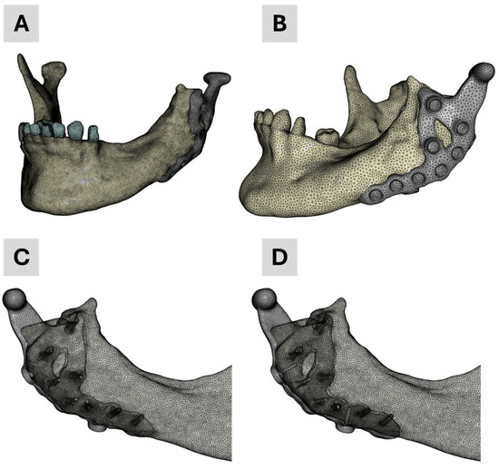Finite element meshes of the four models used in the academic workflow: (A) Model 1—segmentation only; (B) Model 4—used for contact simulations; (C) Model 2—final treatment model combining segmentation and CAD prosthesis; (D) Model 3—planning stage model with two additional dummy screws.