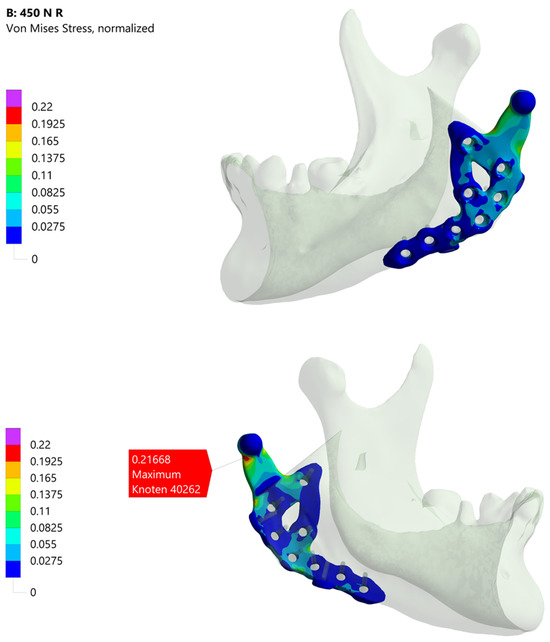 Illustration of the simulation result of the industrial workflow. The images show the normalized von Mises stress distribution of the prosthesis for the given molar bite force.