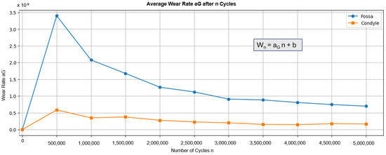 Graph displaying the average wear rate of the fossa and condyle components during wear testing in steps of 500,000 cycles. The wear rate was calculated according to ISO 14243-2, chapter 4.6.5. Here, Wn is the net loss in mass after n cycles and b is a constant.