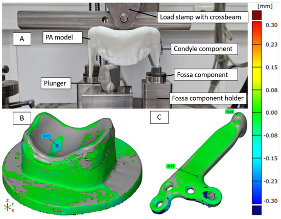 Illustration of the static compression test of the TMJ prosthesis by KLS Martin. (A) The test setup used for the compression test. (B,C) An example of a comparison of the surface of a fossa (B) and condyle (C) component before and after loading.