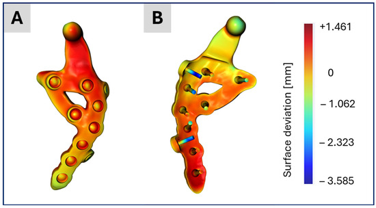 Illustration of the surface deviation in millimeter of the CAD-based TMJ prosthesis after their placement on the segmented TMJ prosthesis in the CT image stack. The highest differences are at the two dummy screws which are of course missing in the segmented TMJ prosthesis. (A) shows the lateral view on the prosthesis and (B) the backside and the screws.