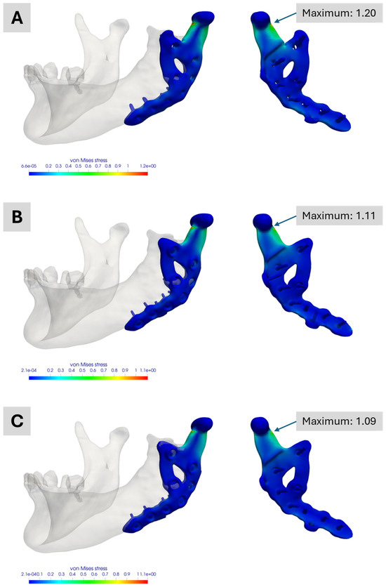 Simulation results of the Models No. 1, No. 2 and No. 3 in the academic workflow. (A) Model No. 1 based on the segmentation results. (B) Model No. 2 combining segmentation and CAD data of the prosthesis for real treatment. (C) Model No. 3 combining segmentation and CAD data of the prosthesis with the two additional screws. All images show the von Mises stress distribution of the prosthesis for the considered molar bite force.