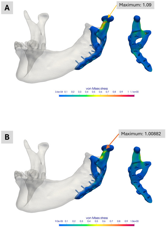 Illustration of the simulation result comparing the influence of contact conditions between prosthesis and mandibular. (A) Normalized von Mises stress distribution for the simplified version of Model 3 without contact conditions. (B) Normalized von Mises stress distribution for the same model with contact conditions. In the case of contact conditions, the peak stress is almost 9 percent lower.
