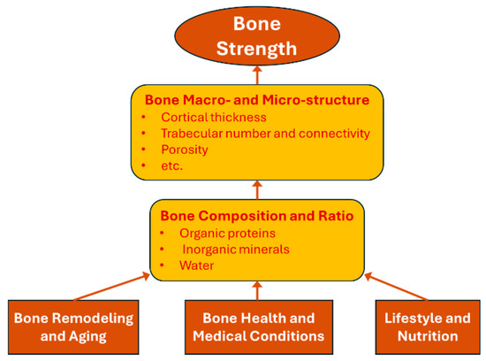 The following subsections will first examine the roles of bone composition and bone structure in regulating bone strength. Next, we will discuss how these factors are influenced by various clinical risk factors, including aging, bone health and medical conditions, and lifestyle and nutrition.