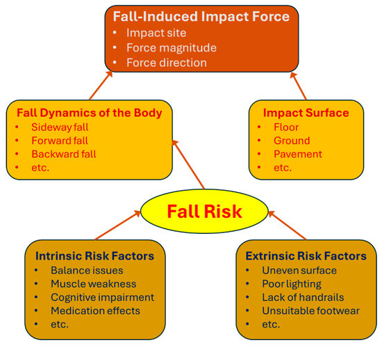 Factors affecting fall risk can be divided into intrinsic and extrinsic factors. Intrinsic factors are individual-specific characteristics that influence balance, coordination, and stability. Key intrinsic factors include muscle strength and balance, age and mobility, sensory impairments, cognitive function, and medical conditions [193,194,195,196]. Weak lower body muscles are particularly significant, as they impair balance and make it difficult to recover from a loss of stability. Reduced muscle strength also limits one’s ability to make rapid corrective movements to prevent a fall. Aging is associated with declines in muscle mass, joint flexibility, and proprioception, all of which negatively impact balance and coordination. Limited mobility, often due to joint issues or arthritis, further increases fall risk. Sensory impairments, such as poor vision and hearing, reduce spatial awareness, making it challenging to navigate safely. Cognitive impairments (e.g., dementia or mild cognitive decline) can also increase fall risk by impairing judgment and response time, making individuals less likely to recognize and avoid hazards. Medical conditions, such as diabetes (which can impair nerve sensitivity) and cardiovascular disease (affecting circulation and stability), further compromise balance.