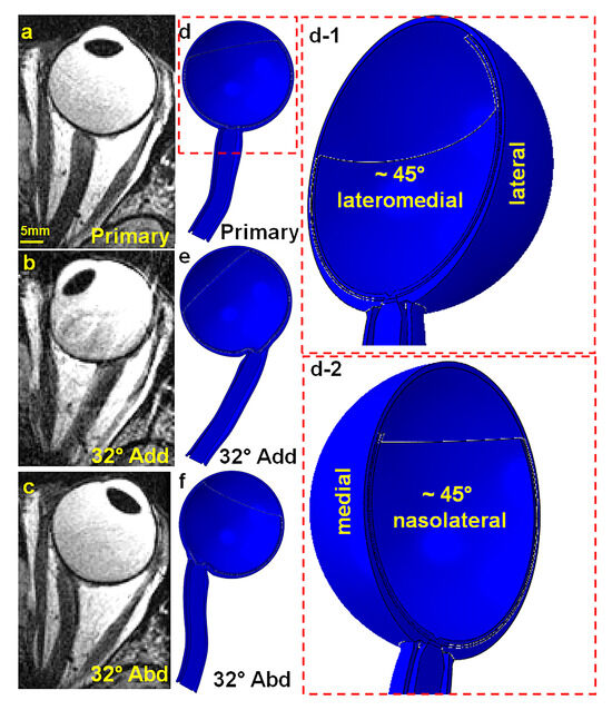 Axial MRI views of the left orbit: (a) primary gaze, (b) 32° adduction, and (c) 32° abduction. Hemisymmetric axial view generated by ABAQUS for (d) primary gaze (d-1) in ~45° lateromedial perspective and (d-2) ~45° nasolateral perspective, (e) 32° adduction, and (f) 32° abduction.