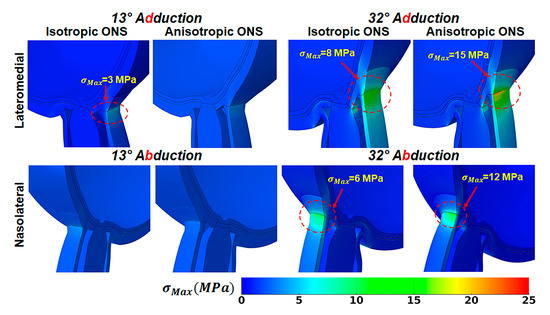 Quantitatively, during 32° adduction, the maximum principal stress at the ONS-sclera junction increased from 8 MPa in the isotropic model to 15 MPa in the anisotropic model, while strain decreased from approximately 40% to 30%. Similarly, the traction force at the optic nerve head (ONH) rose from 500 mN (isotropic) to 1.1 N (anisotropic), indicating increased mechanical loading localized to the sheath–sclera interface. In contrast, maximum stress adjacent to the ONH itself decreased from 5 MPa (isotropic) to 3 MPa (anisotropic), suggesting a stress-shielding effect of the anisotropic ONS.