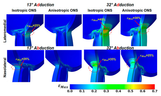 Figure 6 illustrates the impact of ONS anisotropy on the distribution of maximum principal strain, , in the ONS-sclera junction. For the isotropic ONS, average in the ONS-sclera junction reaches approximately 25% at 13° and 40% at 32° adduction. During abduction, these values are greatest on the medial side within the ONS-sclera junction, with strains reaching about 20% at 13° and 35% at 32° adduction.