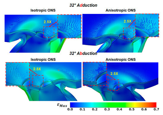Conversely, the anisotropic ONS results in a more uniform strain distribution within the ONS-sclera junction, resulting in lower average levels. During 32° adduction, strain averaged around 30% on the lateral side of the ONS-sclera junction, while during abduction, it was approximately 25% at the medial side.