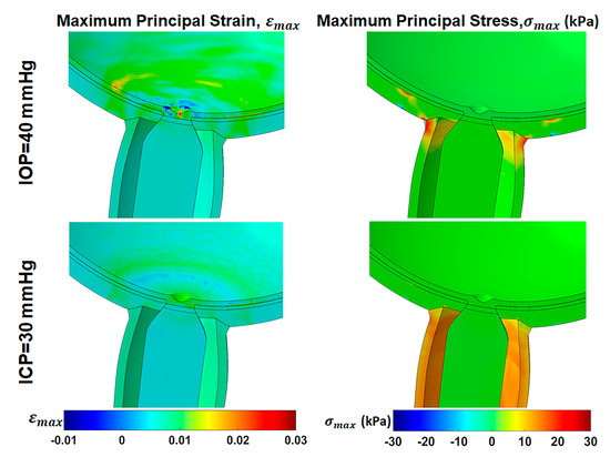 To compare ocular tissue mechanics under elevated IOP and ICP with their response to large horizontal eye movements, we evaluated the effects of high IOP (40 mmHg) and ICP (30 mmHg) during central gaze, assuming an anisotropic ONS. Elevated IOP or ICP results in maximum tensile strains of 0.5–3% in the ONS or optic cup and 20 kPa maximum tensile stress in the ONS junction with the sclera. Previous FEMs indicated that increasing IOP from 15 mmHg to 40–50 mmHg produces 3% average strains and 40 kPa stresses in the ONH region, depending on tissue stiffness and geometry [52,53]. Similarly, increasing ICP to 15–20 mmHg increases strain in the ONS junction with the sclera to 0.5–2% [52,54].
