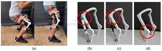The physical model of the exoskeleton (a) The subject wears the exoskeleton (b) The exoskeleton with helical compression spring (c) The exoskeleton with hydraulic cylinder rod (d) The exoskeleton with torsion spring. The red circles in (b–d) indicate the position of the slot.