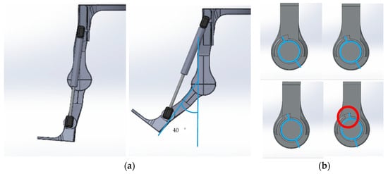 A lightweight, passive-powered, assistive exoskeleton with a simple mechanism is designed to eliminate the intricate variables of weights and unnatural active power of actuators. This design aims to clarify the factors influencing body motion while using the exoskeleton. The designed exoskeleton is shown in Figure 1. In order to provide assistance in standing-from-squatting and some specific duration of gait without obstruction by the resilient component in most level walking, a slot is designed for helical compression springs, hydraulic cylinder rods, and torsion springs as shown in the red circles of Figure 1 and the Solidworks design drawings in Figure 2. Through the designed slot on the mechanism, the resilient components will not be compressed until a critical value of the flexion angle of the thigh and shank component. In this experiment, the critical angle is set to be 40 degrees for the exoskeleton. The resilient component will not be compressed during most of the normal speed level walking motion. Once the exoskeleton’s flexion angle surpasses 40 degrees, the resilient component will undergo compression. Except for squatting, this compressed state primarily occurs during the initial and mid-swing phases of normal-speed level walking. Additionally, the extent of unrestricted movement can be fine-tuned by modifying the slot dimensions based on requirements. Figure 3 shows the positions of the exoskeleton at various angles. During steps 1–2, the knee begins to bend, but the critical angle has not yet been reached. The upper end of the resilient component has not contacted the top of the slot, so the resilient component remains uncompressed. As observed in the blue-circled area, there is no change in the length of the resilient component. At step 3, the upper end of the resilient component contacts the top of the slot. As the knee continues to bend, the resilient component becomes compressed. This can be observed in steps 4–5, where the red-circled area shows a shortening of the resilient component. Following this, the knee begins to extend. However, during steps 6–7, the resilient component remains compressed, thus capable of providing a rebound force. As knee extension continues, by step 8, the upper end of the resilient component starts to separate from the slot. In steps 8–10, the component is no longer compressed and returns to its natural length.