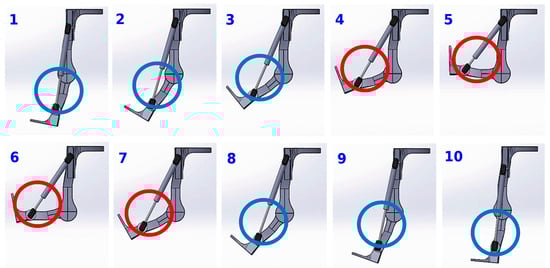 The positions of the exoskeleton at various angles. The figure divides the knee movement from extension to flexion and back to extension into ten steps, as indicated by the numbers 1–10. The circles in each step highlight the exposed length of the resilient component extending from the covering tube. This exposed segment visually represents the compression state of the resilient component. Blue circles indicate the component is in an uncompressed state, while red circles indicate that it is compressed.
