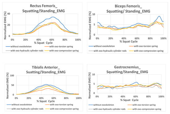 The normalized EMG signals of the ten subjects with/without the exoskeleton during squatting and standing-from-squatting motion are obtained, and the mean values of ten subjects are measured and plotted in Figure 4 for rectus femoris, biceps femoris, tibialis anterior, and gastrocnemius. It is evident that the normalized EMG of the subjects without wearing the exoskeleton is larger than those with the exoskeleton for rectus femoris, biceps femoris, and tibialis anterior, especially for rectus femoris. This indicates that wearing the exoskeleton can reduce muscle effort during squatting/standing. The active muscles align with those involved in the squatting and rising motion, except for the gastrocnemius, which shows unobvious differences between with and without the exoskeleton. It is speculated that the EMG sensor is positioned close to the exoskeleton and could potentially introduce interference during squatting movement.
