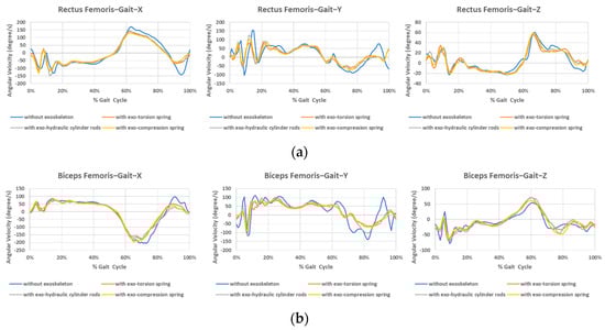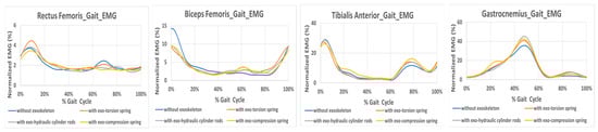 It is also interesting to note, as indicated in Figure 6, that the biceps femoris muscle effort at the initial contact of gait without the exoskeleton is greater than that of wearing the exoskeleton. This phenomenon begins from the terminal swing. The greater range of motion without the exoskeleton could lead to this effect, requiring increased effort from the biceps femoris to maintain thigh stability during heel strike. As we can observe, the greater values of flexion/extension angular velocity are at terminal swing. However, it could also result from the assistance provided by the resilient components. Some further study is also needed for verification. The EMG difference between wearing the compression-spring exoskeleton and not wearing the exoskeleton is pronounced for all muscles tested during level walking, as shown in Figure 5b. Different variations are observed with other resilient components.