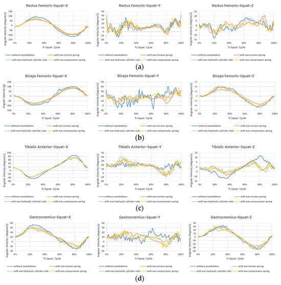Angular velocity during the squatting/standing motion at different sensor positions. (a) Rectus femoris, (b) Biceps femoris, (c) Tibialis anterior, (d) Gastrocnemius.