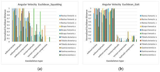 Normalized Euclidean distances between EMG curves (a) during squatting/standing, (b) during gait.