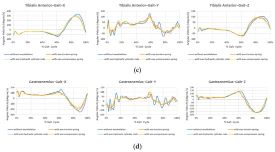 Angular velocity during gait at different sensor positions. (a) Rectus femoris, (b) Biceps femoris, (c) Tibialis anterior, (d) Gastrocnemius.