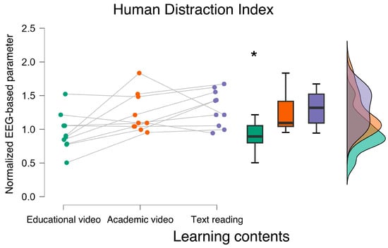 The ANOVA performed on the Human Distraction Index (i.e., HDI) revealed that the neurophysiological distraction evaluation was statistically lower when accessing the educational video material. * indicates the statistical significance (p < 0.05).