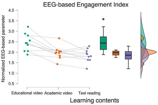 The ANOVA performed on the EEG-based engagement index revealed that participants were neurophysiologically more engaged when exposed to the educational video material. * indicates the statistical significance (p < 0.05).