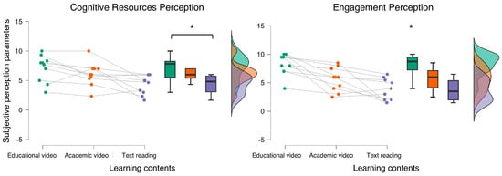 The statistical analysis of the subjective scores revealed that participants perceived as easier and more engaging than the educational video in terms of cognitive impact. * indicates the statistical significance (p < 0.05).